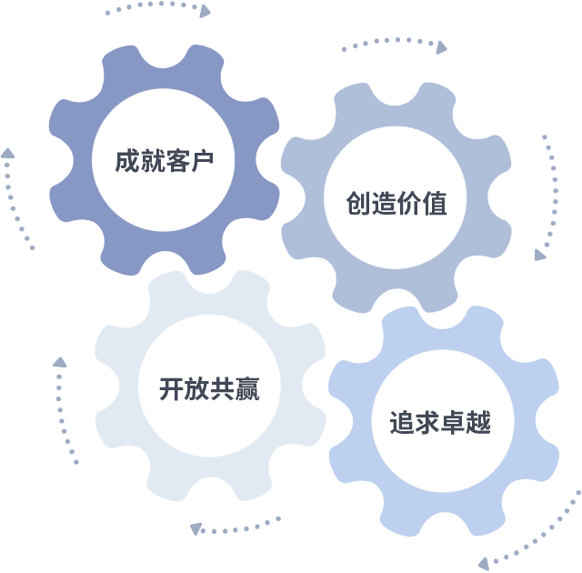 成就客户是一切决策的出发点,,创造价值是衡量所有工作的标准,,,,追求卓越是我们做事做人的态度,,,开放共赢是我们的格局也是最终的结果。。。。价值观的齿轮环环相扣,,,推动着组织里的每个人不断向前。。。。