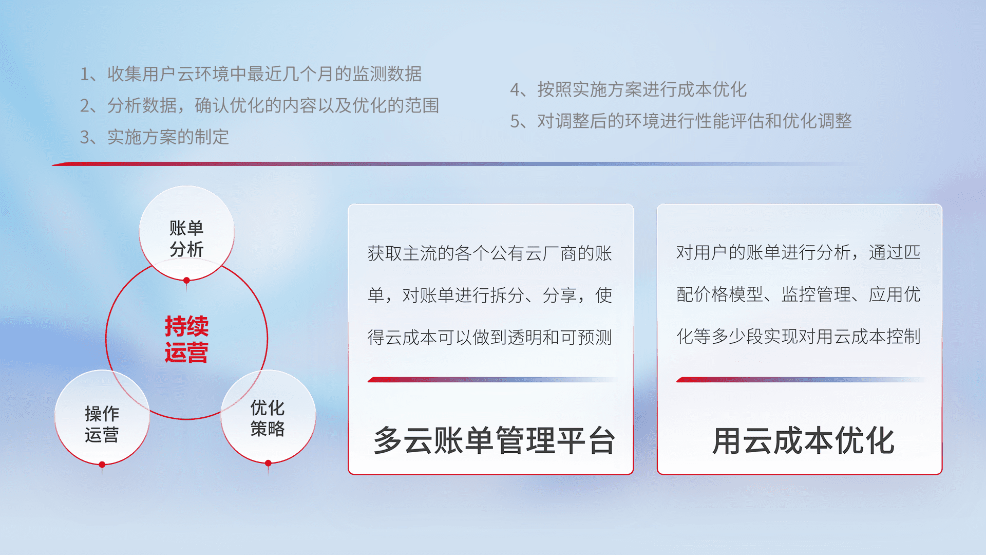 通过多云纳管,,以统一的资源数据模型把客户的云资源进行抽象和封装,,,,进而实现对多云资源的统一操作,,,,保障云资源管理的可靠性、、、、稳定性与可用性。。。量身定制化运维内容,,,,配置、、、、开发运维、、补丁管理、、、备份、、、、监控、、、认证和访问管理、、、审计和日常巡检等,,保障在用云过程中的可靠度,,,,稳定度以及高可用率。。。