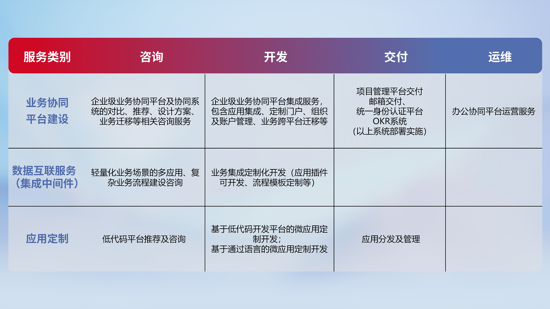 针对钉钉、、企微、、、、IDaas等平台级产品提供产品的规划、、、方案、、交付、、定制化开发等服务,,,,实现如统一协同办公、、、、智能客户服务、、、、混合会议管理、、、智能数据查询、、等业务场景,,实现数字化转型。。。。